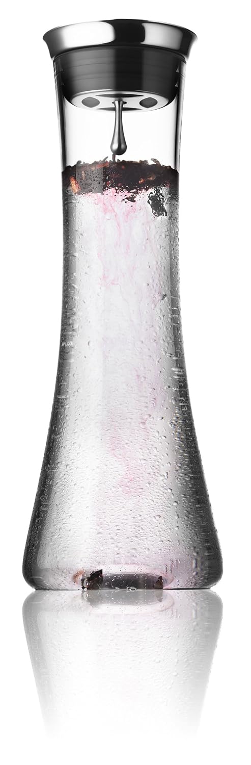 La forma sciancrata della caraffa la rende facile da prendere e il coperchio è munito di un meccanismo che si apre automaticamente quando si versa l'acqua. Il coperchio fa sì che i cubetti di ghiaccio, le fette di lime, le foglie di menta e altre gustose aggiunte restino nella caraffa quando si versa e, allo stesso tempo, che niente di indesiderato cada nell'acqua: in questo modo la caraffa può essere usata anche all'aperto.